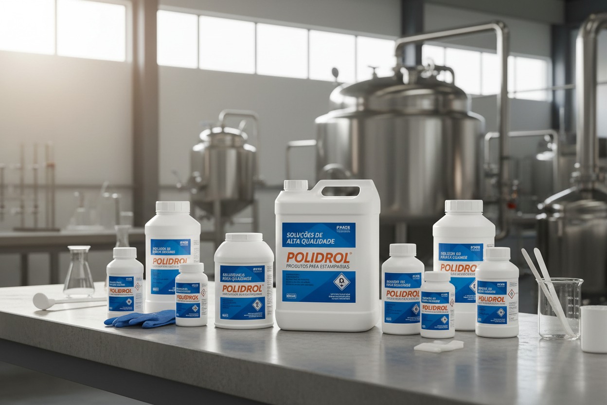 A linha de produtos da Polidrol abrange diversos tipos de soluções químicas essenciais para a estamparia, tais como: